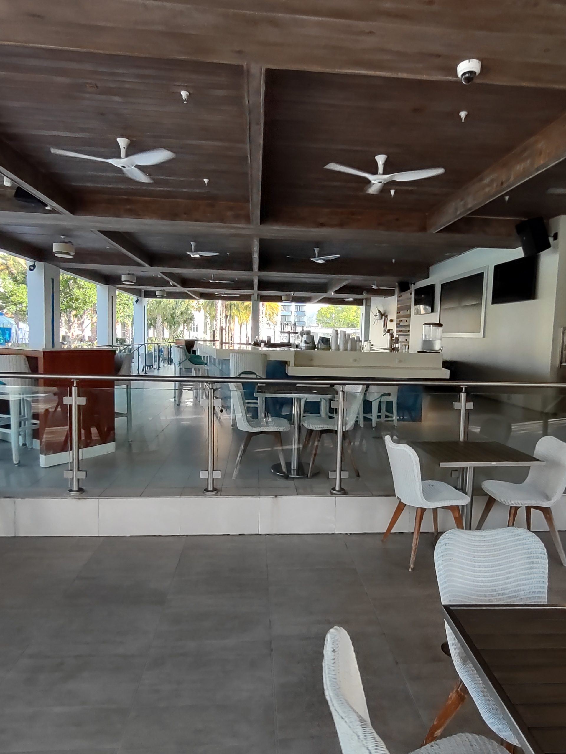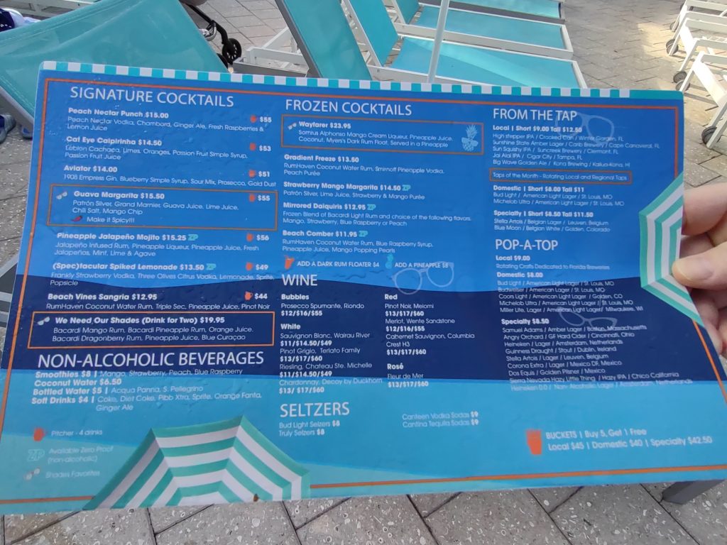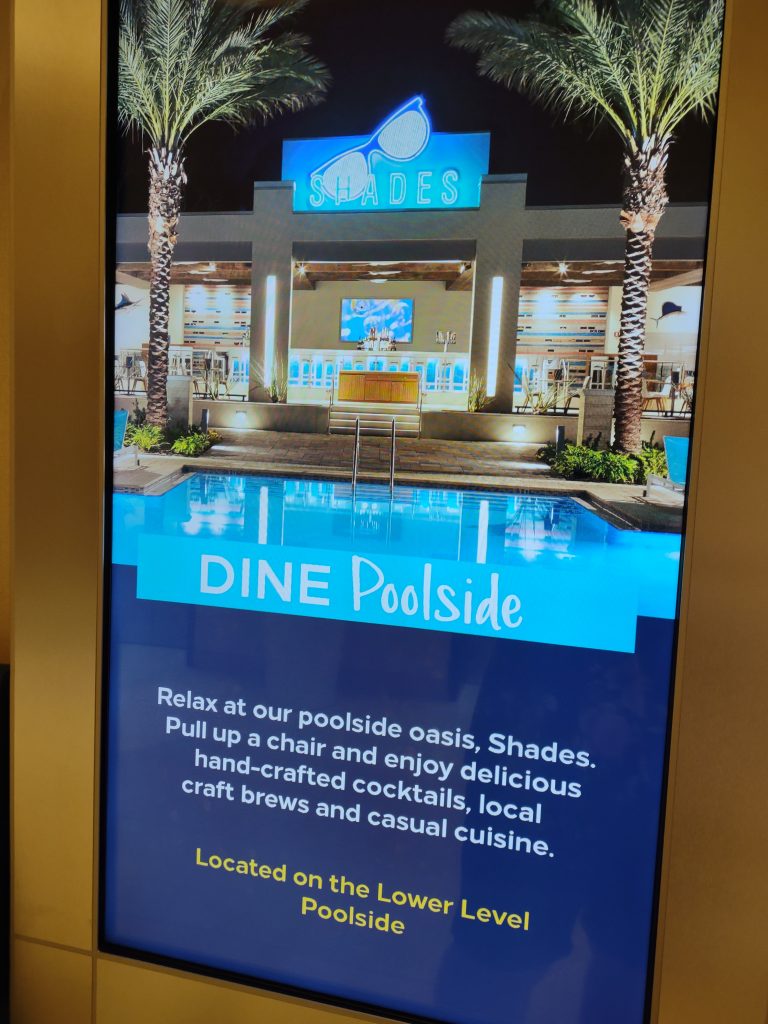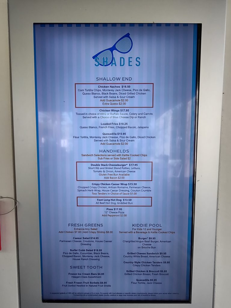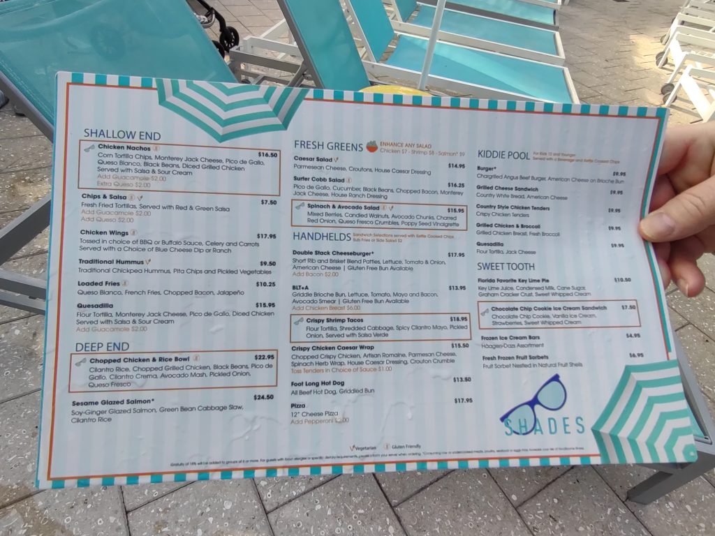 Shades is the poolside restaurant and bar. If you walked up to the bar, you could be seated and eat restaurant-style or place walk-up orders to pick up at the window. Another great option was to eat poolside. They had menus throughout the chaise lounges and staff taking orders while we were there. They have a “kid-friendly” menu as well as an adult menu with a variety of drinks to choose from! Most of the chairs in the restaurant are free of arms/sides. It was all very comfortable and sturdy options which included to side couch areas with fire pits at each.