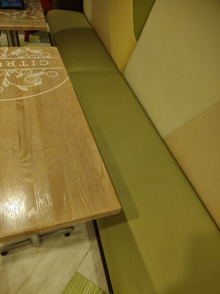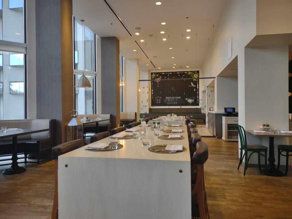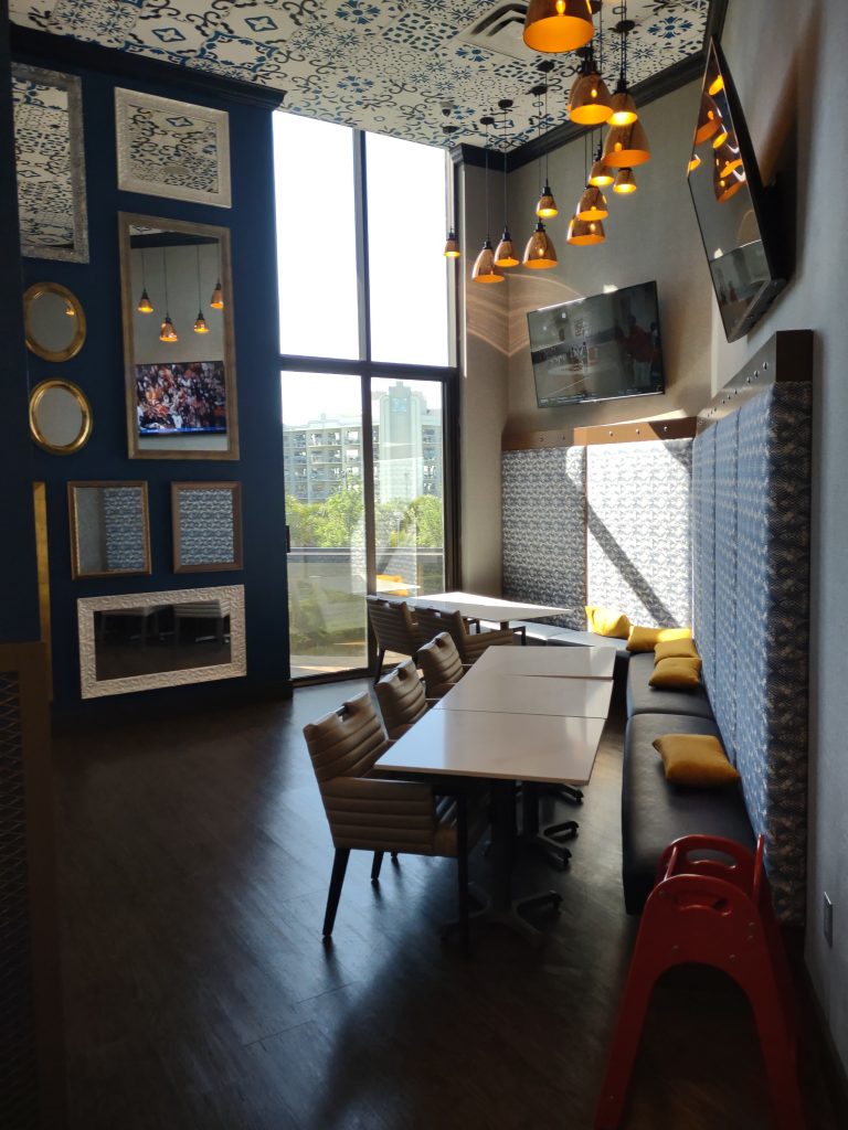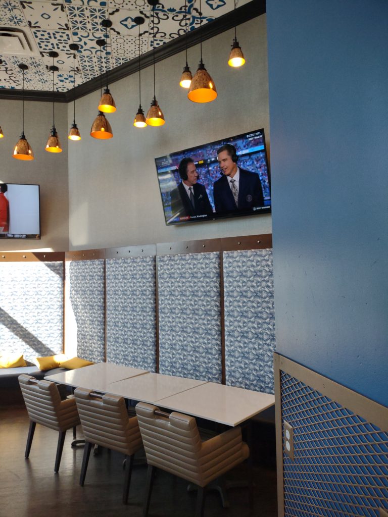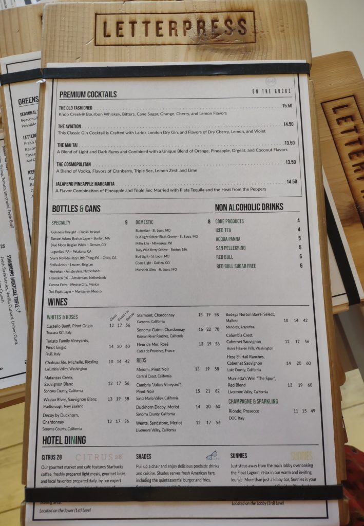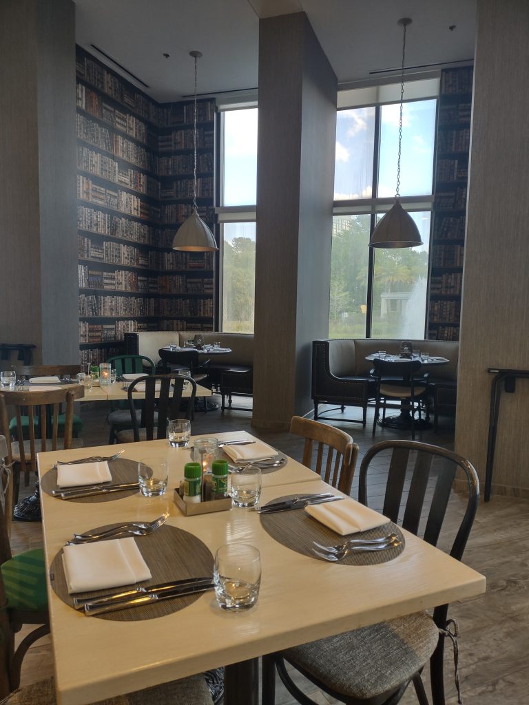 Shades is the poolside restaurant and bar. If you walked up to the bar, you could be seated and eat restaurant-style or place walk-up orders to pick up at the window. Another great option was to eat poolside. They had menus throughout the chaise lounges and staff taking orders while we were there. They have a “kid-friendly” menu as well as an adult menu with a variety of drinks to choose from! Most of the chairs in the restaurant are free of arms/sides. It was all very comfortable and sturdy options which included to side couch areas with fire pits at each.