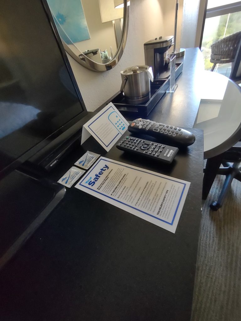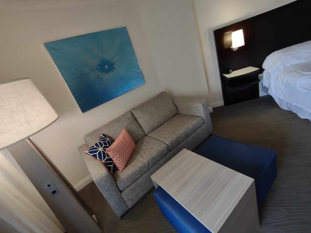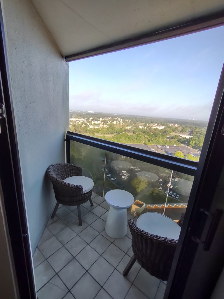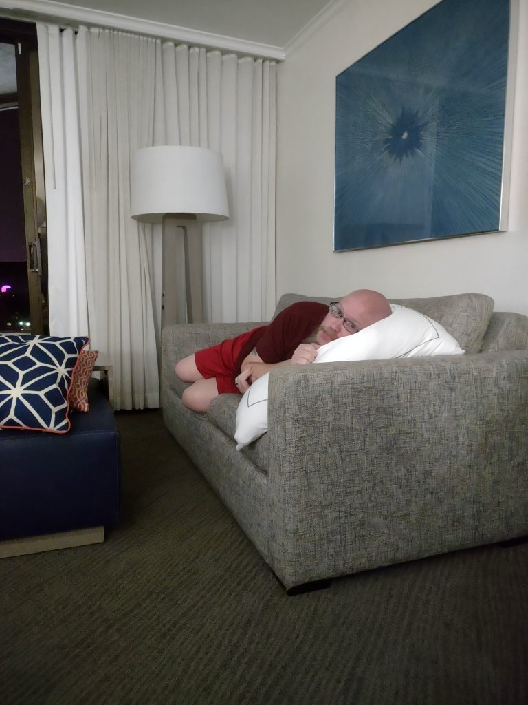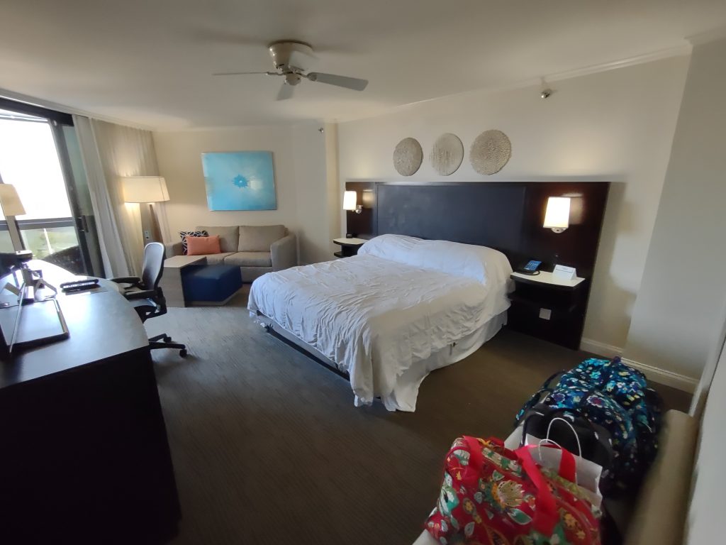 We had a king bed room. The room had an additional couch and chair/table seating area. The room had a TV with DVD player attached. You could bring your own movies or movies were available to rent from machines in the lobby! Like Redbox for hotels! They also had plenty of options on the TV itself if renting via a box isn’t your style. The room came with multiple places to plug in your electronics… From places by each bed, attached to the lights, along the walls, the number of places to connect your devices was vast. All of the chairs in the room were comfy and open. I had no problems fitting on any of them. However, the balcony chairs squeezed my hips a bit. It was still comfortable enough to enjoy sitting out there, but if I had been any bigger in the hips, I might not have wanted to sit outside. The bathroom was spacious. I didn’t have any problems with the toilet or shower. Though the shower is long vs. wide. It wasn’t uncomfortable at all.