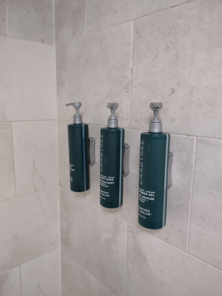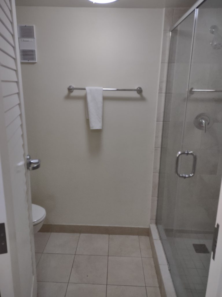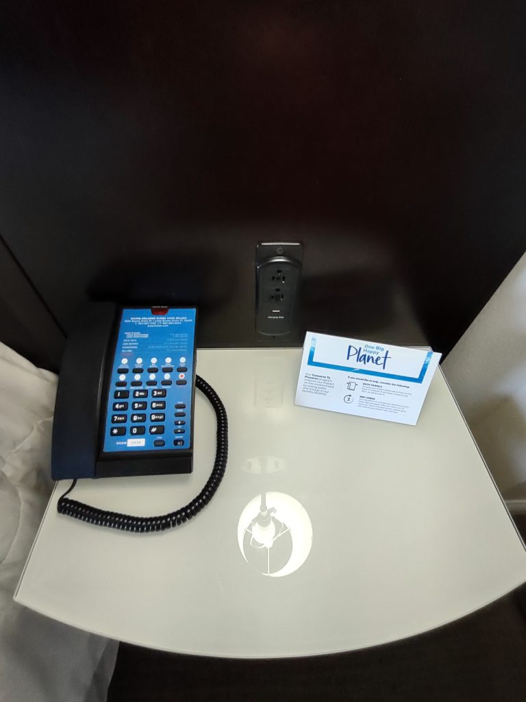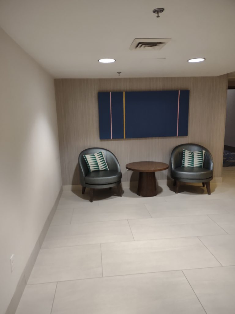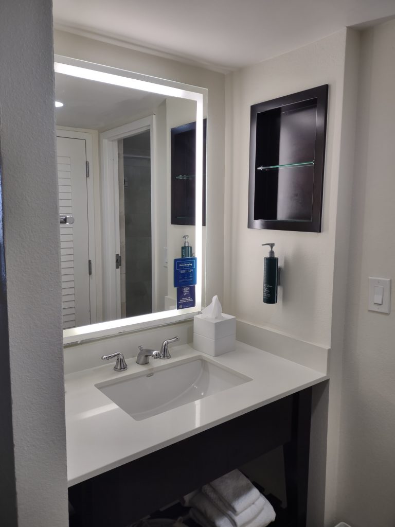 We had a king bed room. The room had an additional couch and chair/table seating area. The room had a TV with DVD player attached. You could bring your own movies or movies were available to rent from machines in the lobby! Like Redbox for hotels! They also had plenty of options on the TV itself if renting via a box isn’t your style. The room came with multiple places to plug in your electronics… From places by each bed, attached to the lights, along the walls, the number of places to connect your devices was vast. All of the chairs in the room were comfy and open. I had no problems fitting on any of them. However, the balcony chairs squeezed my hips a bit. It was still comfortable enough to enjoy sitting out there, but if I had been any bigger in the hips, I might not have wanted to sit outside. The bathroom was spacious. I didn’t have any problems with the toilet or shower. Though the shower is long vs. wide. It wasn’t uncomfortable at all.